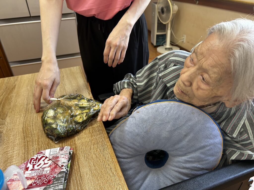 スタッフと考えリハビリがわりにきゅうりもみをお願いしました。