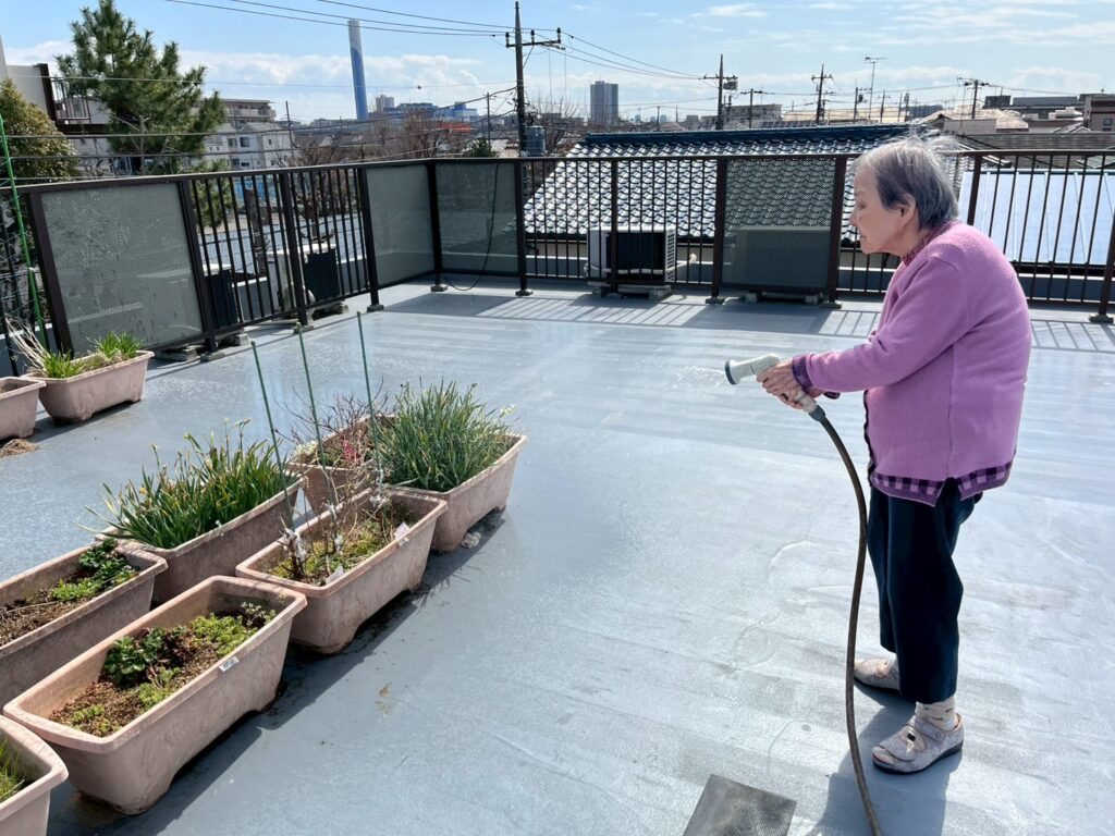おふたりで屋上へ、植物に水やりをされるKさん